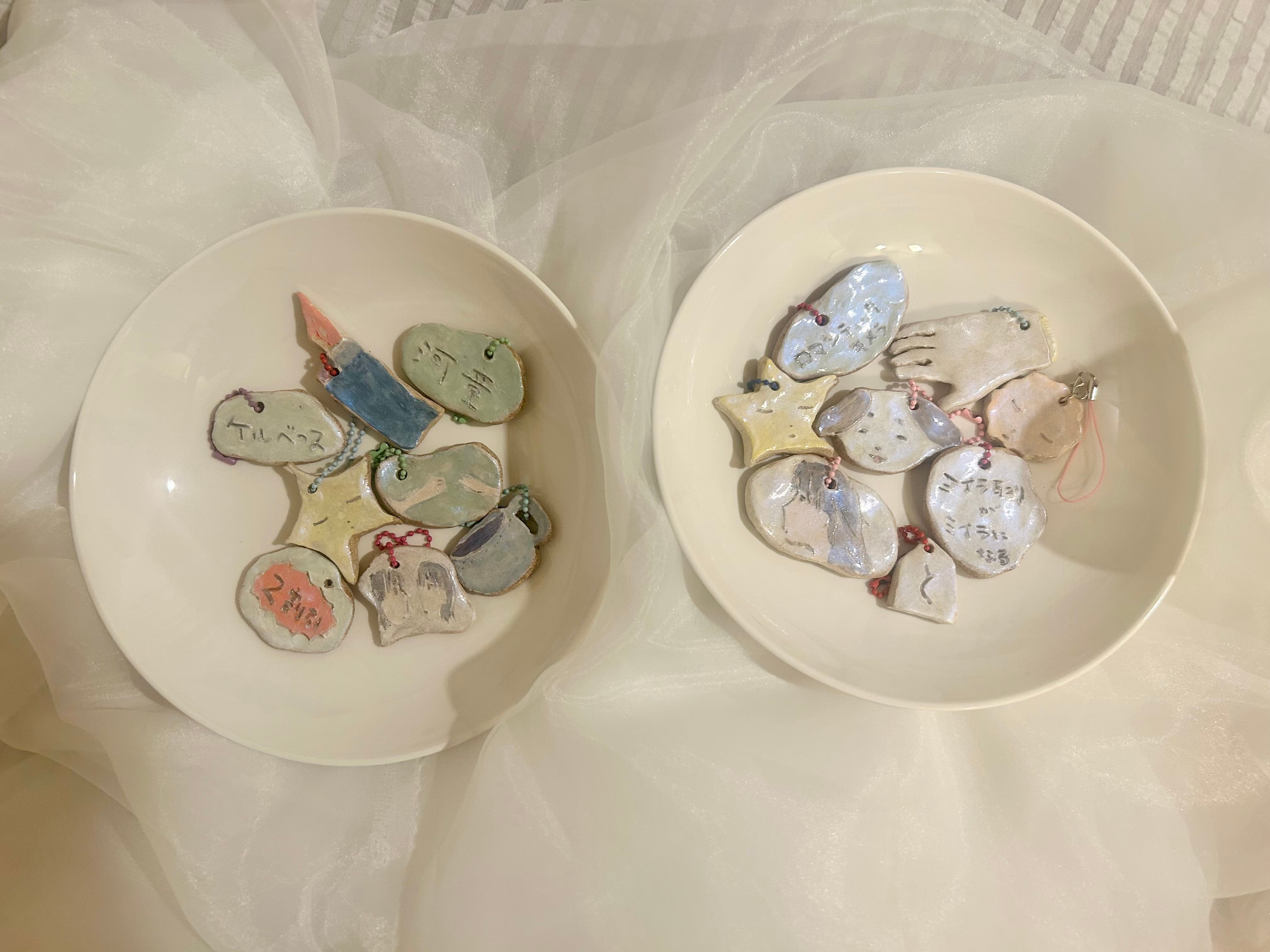 さらに特典としてミニ陶器キーホルダーをランダムでお付けしています。(大変申し訳ないことに大変衝撃に弱めです。)あなたのラッキーアイテムになりますように。
